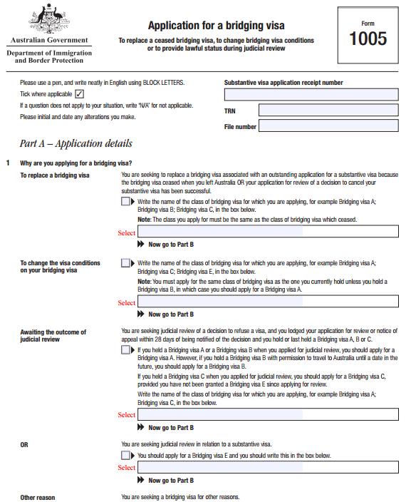 对于人在澳洲,正在申请实质性签证,而目前已经成为非法留居者,需要填写Form 1005申请过桥签证C。