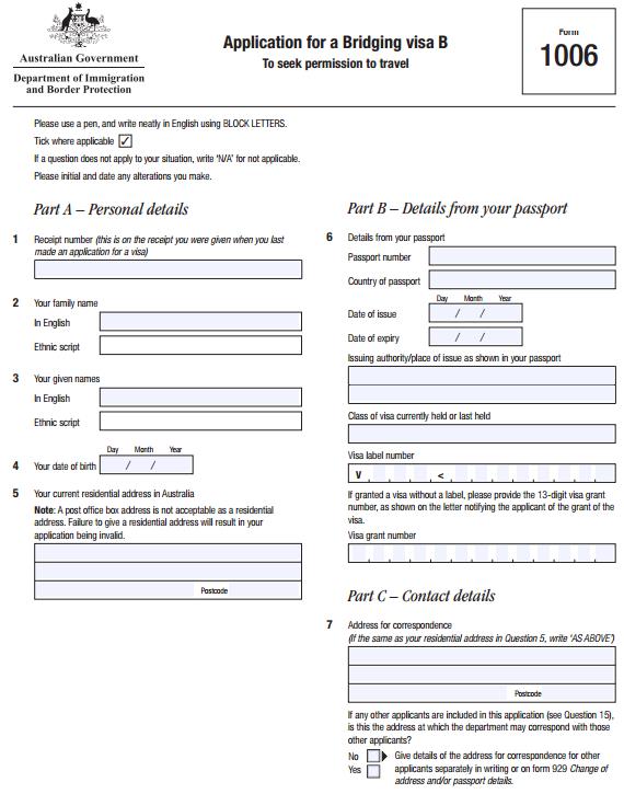 1006表格是申请澳洲过桥签证B类时必须填写的申请表。此表格需使用钢笔,并使用正楷英文整齐书写。如果表格中的问题并不适用于你的情况,请写“N / a”表示不适用。填写完成后请签上姓名和日期。